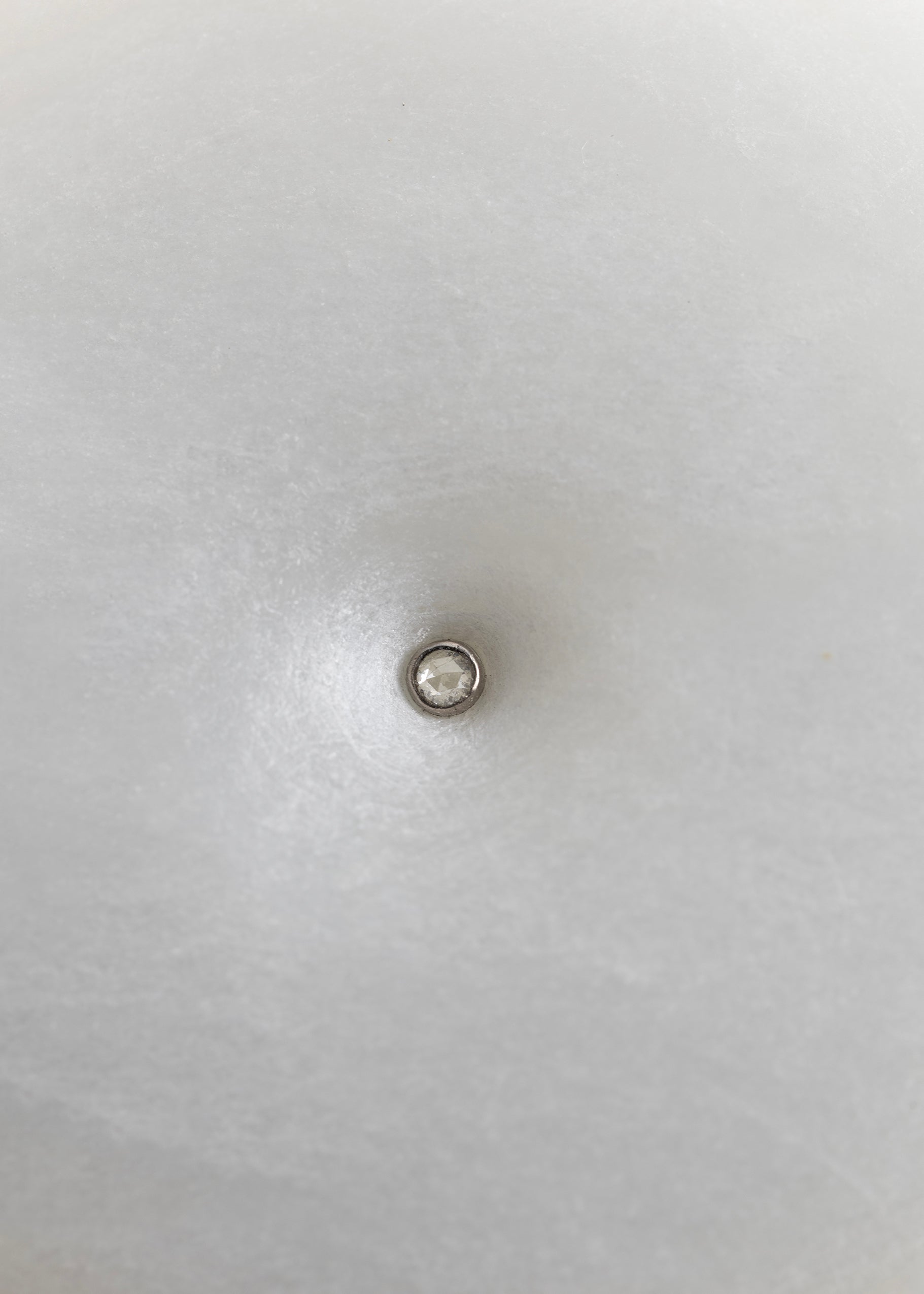 At the end of the sculpting process, a 2mm rose-cut natural diamond is set in a white gold mouth which is in turn set in its centre.