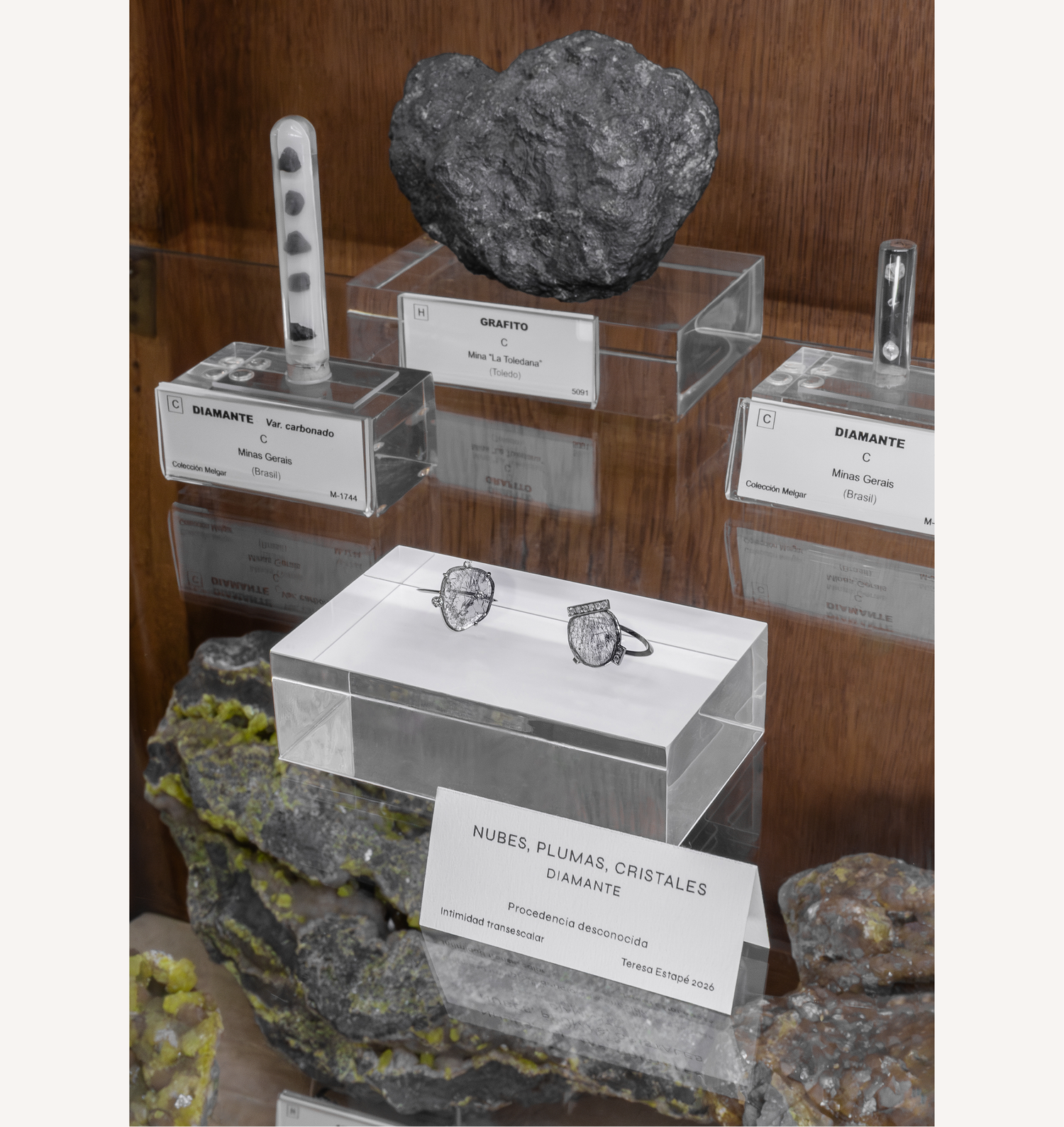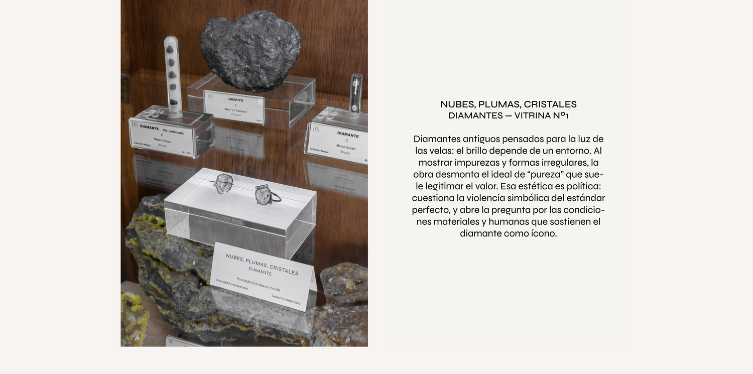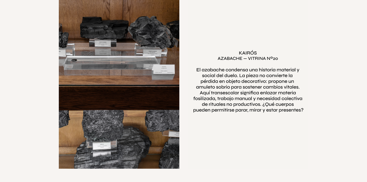 Las series de Estapé tensionan, una a una, esa pregunta. Talco y diamante reúnen extremos físicos y simbólicos, haciendo que una escala mineral se convierta en experiencia táctil. La pirita desarma el relato del oro: el brillo ya no garantiza prestigio y la geometría mineral se impone como protagonista. El azabache desplaza el tiempo de la mercancía hacia el tiempo del duelo: una joya que no celebra el éxito, sino que acompaña pérdidas y cambios, y reclama espacio social para estar presente.