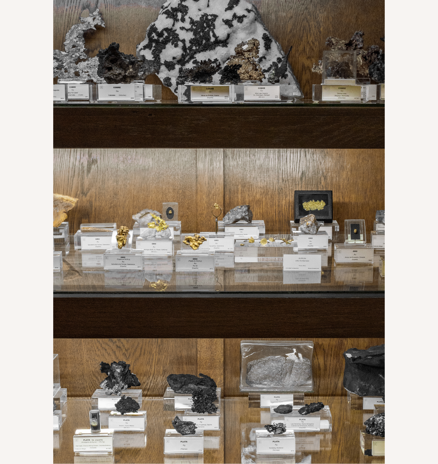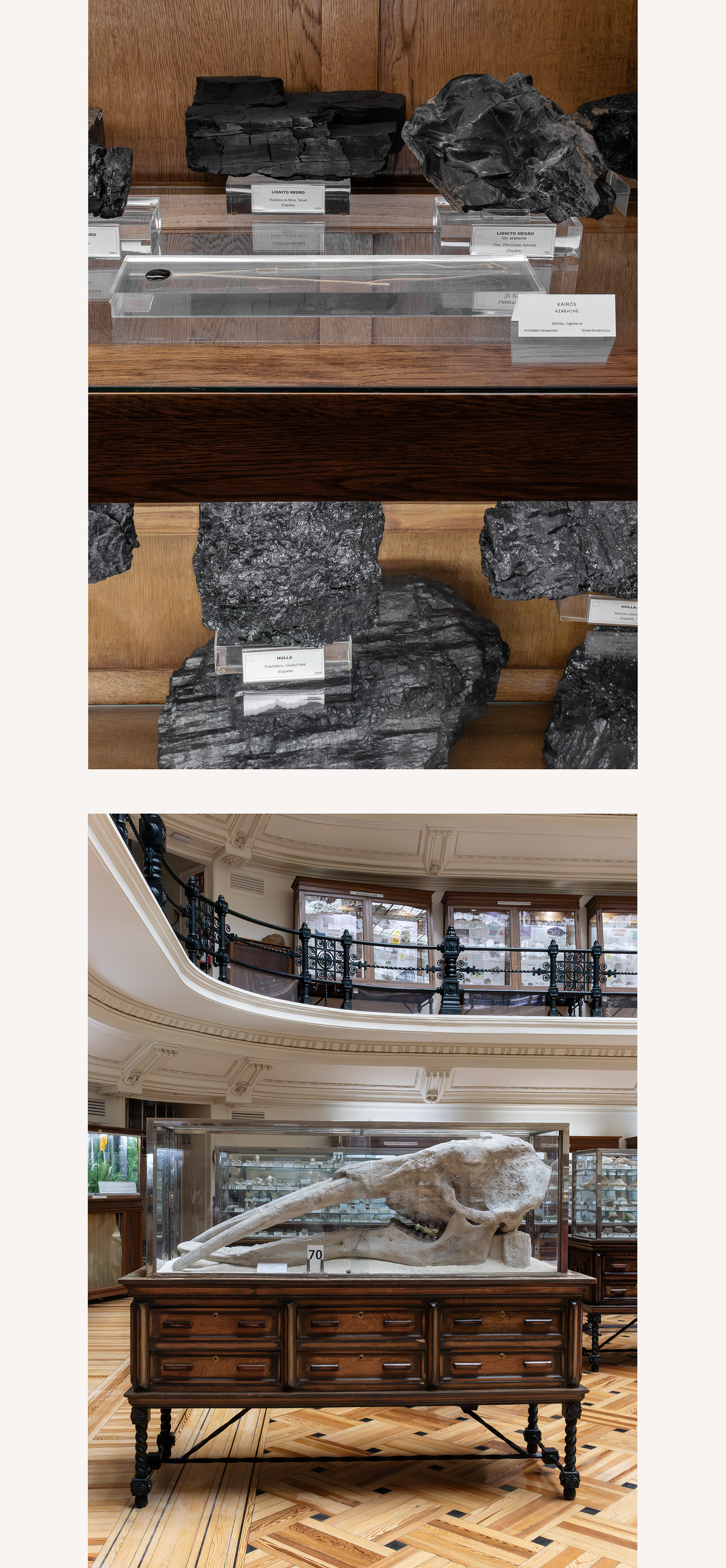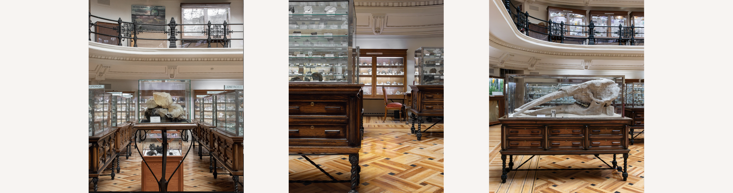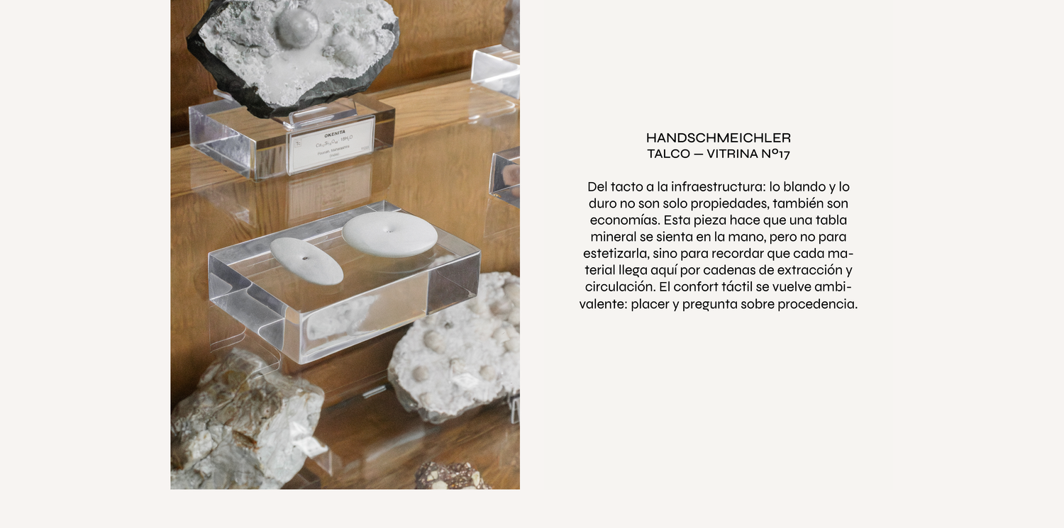 El Museo Geominero conserva un archivo de tiempos no humanos: minerales, rocas y fósiles que registran procesos de presión, calor y sedimentación. Pero esos tiempos no llegan solos. La vitrina científica, su orden, sus etiquetas, su promesa de objetividad, puede producir una ilusión: que la materia está ahí como evidencia neutra, separada de las condiciones históricas y políticas que permiten extraerla, transportarla, clasificarla y exhibirla. En realidad, muchos minerales son también huellas de infraestructuras: minas, rutas, refinerías, mercados; y de impactos extractivistas distribuidos de forma desigual sobre territorios y cuerpos.