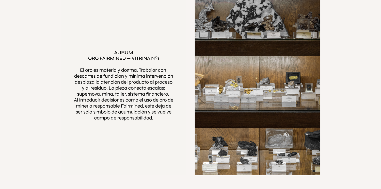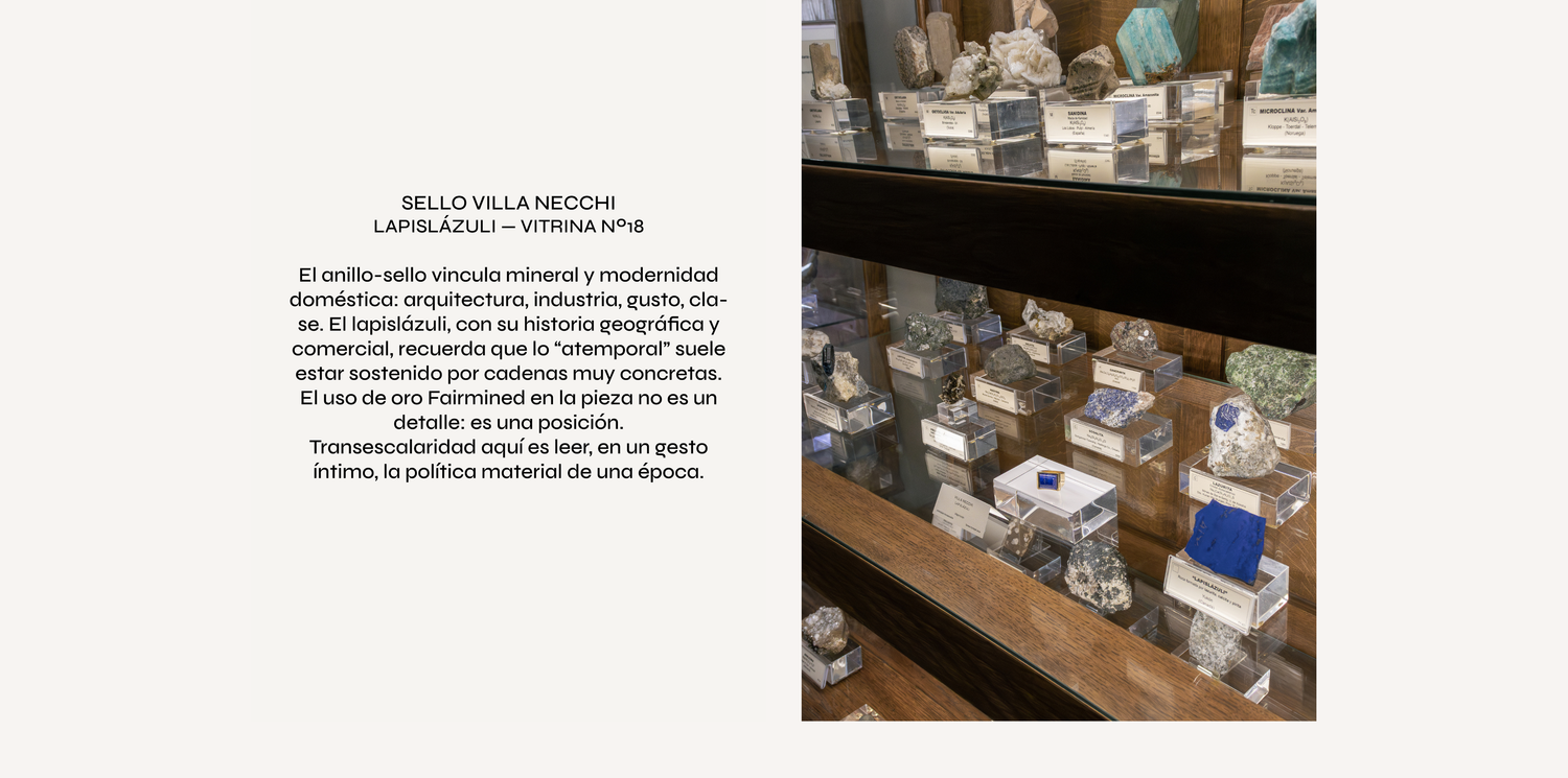 Esta exposición introduce una mediación distinta: piezas de la artista y orfebre Teresa Estapé que trasladan la geología al espacio íntimo del cuerpo. Lo transescalar aquí no es un tránsito romántico de lo pequeño a lo inmenso, sino un circuito completo que conecta mano–piel–pecho con veta–taller–economía. La joya aparece como interfaz: no “adorna” la materia, sino que la vuelve discutible. ¿Qué significa portar un mineral? ¿Qué relaciones, ambientales, laborales, coloniales, afectivas, se condensan en ese gesto?