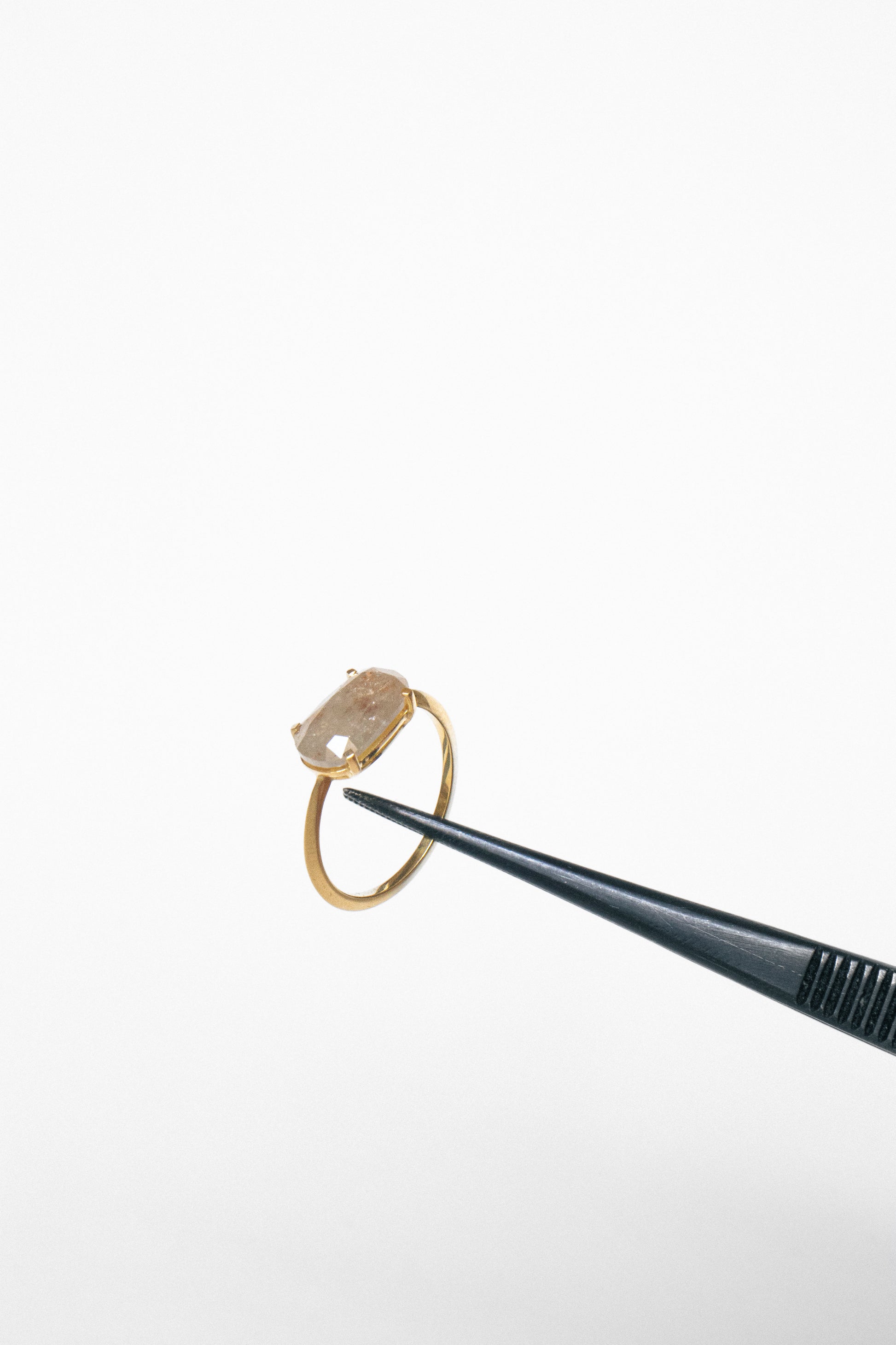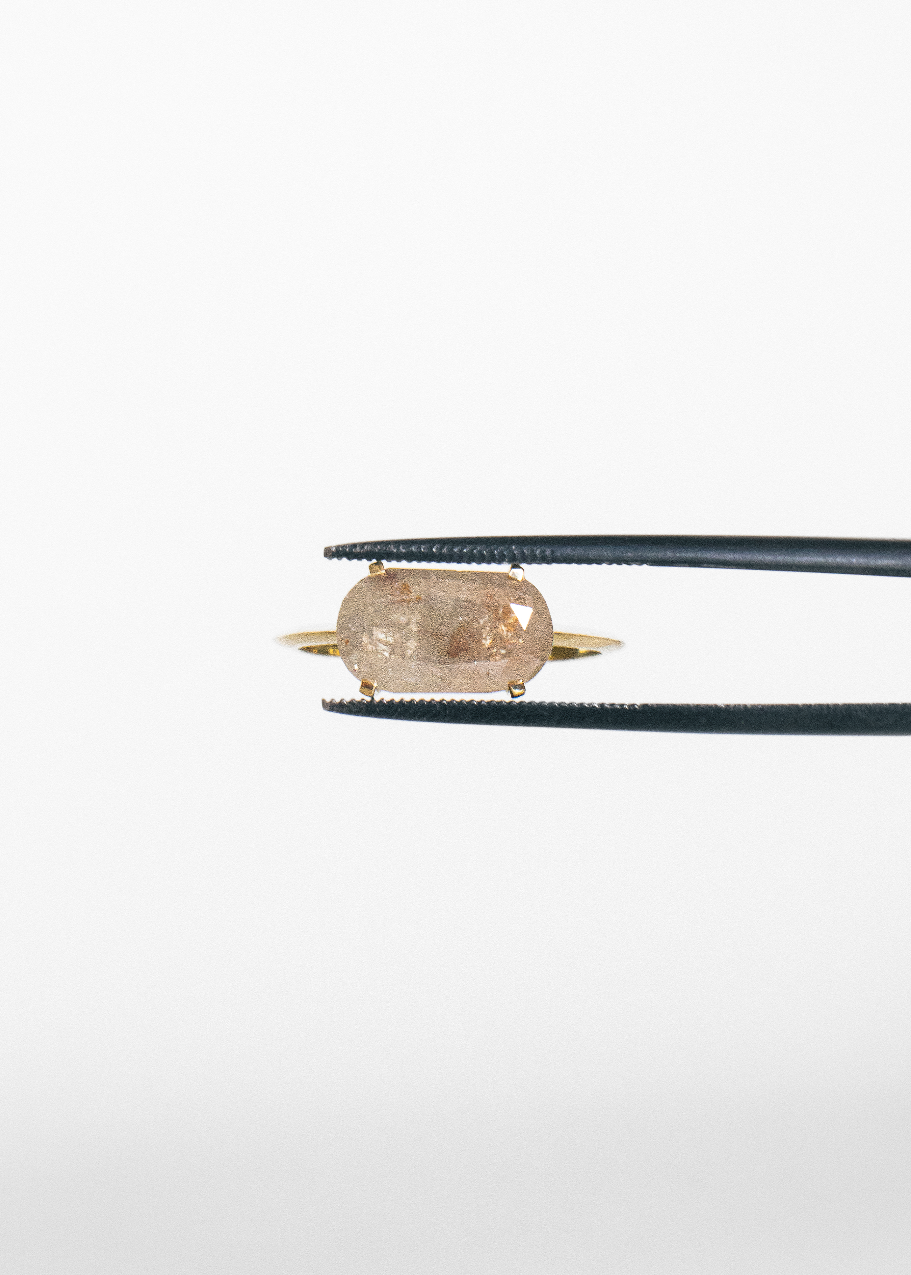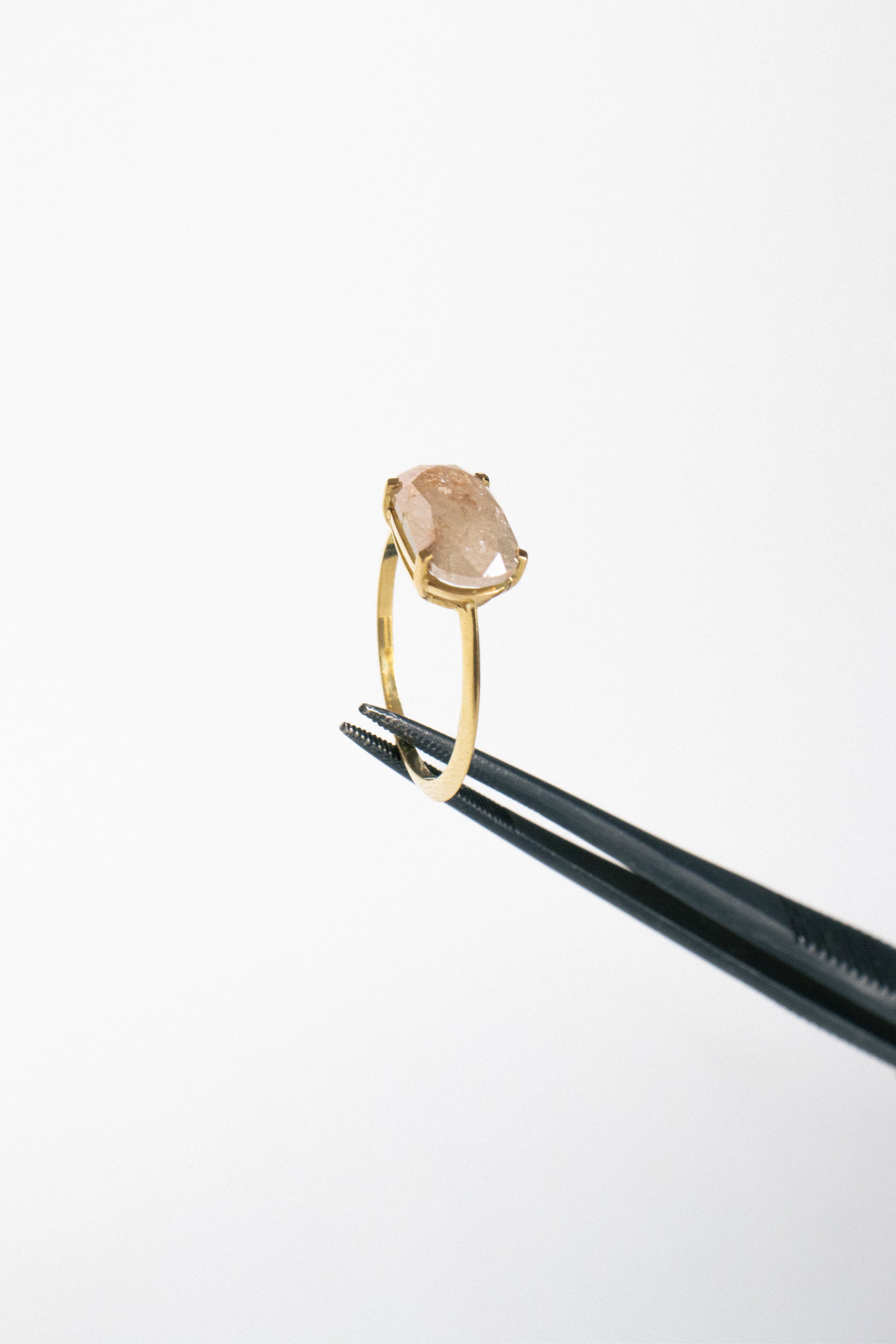 El anillo 002 de la serie “Nubes, plumas, cristales” tiene en el centro de su composición un diamante natural de talla oval antigua de 2,97 quilates engarzado en oro amarillo FAIRMINED de 18 quilates. Sus inclusiones entre las que se encuentran las llamadas nubes, plumas o cristales, le dan a la piedra la calidad de única.
